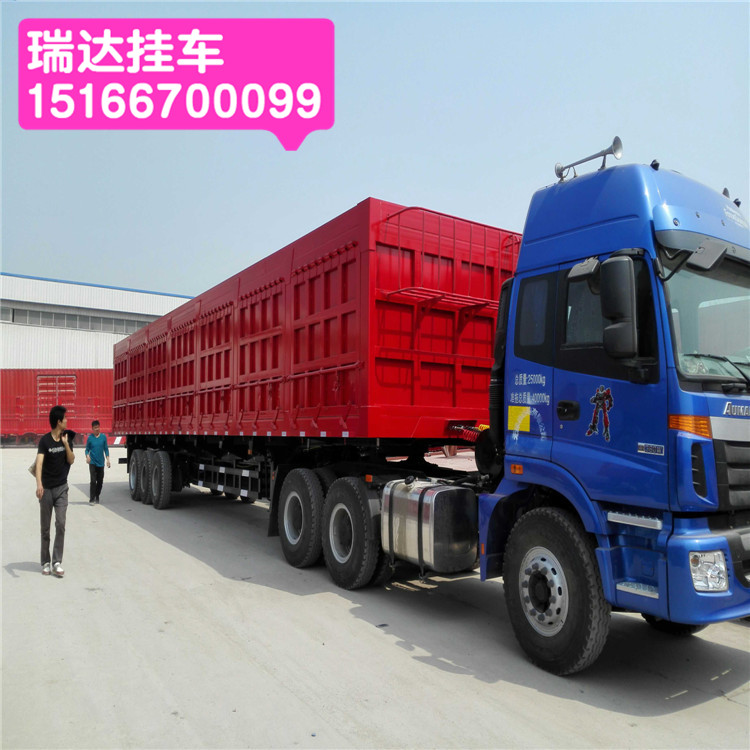 外徑尺寸(按公告):14.6m*2.55m*2.2m,推車附件為大梁延伸型。車輛至上而下配置:上邊梁20扣18槽鋼、上邊梁以下一米六吊開門、掛車為兩面?zhèn)确?、每吊開門為兩根鎖桿加以扣合、大合頁(yè)吊起,底4邊3、下邊梁20槽鋼、箱內(nèi)門柱交叉槽鋼焊接、橫拉為槽鋼焊接、,通稱梁為16槽鋼、付架為18扣18槽鋼、斜撐為14槽鋼加密型、油缸為8+1泰安液壓公司150#三包油缸、大梁520mm上20下20中12錳板焊接工字鋼型、加寬加厚的懸掛系統(tǒng)、特加厚板簧10片、16噸廣東富華橋16噸剎車三根(富華廠無20噸剎車鼓)、鋼圈90加厚鋼圈12只、輪胎為正新全國(guó)聯(lián)保979#1200R22.5鋼絲胎12只、帶淋水器、一個(gè)工具箱、兩個(gè)備胎架、28噸單動(dòng)支腿、加裝ABS廠內(nèi)調(diào)試、帶取力器液壓泵油管全套輔助系統(tǒng),出具14.6米廂式合格證。外露鵝頸(大鵝頸),淋水器安裝兩個(gè)一個(gè)開關(guān)為電磁閥一個(gè)為手動(dòng)閥,液壓油箱為長(zhǎng)方形,液壓油箱安裝在半掛車上,液壓油缸舉升速度一致,發(fā)到派人安裝,調(diào)試。所有焊接地區(qū)牢固美觀,用長(zhǎng)銷子,移為腿部位橫梁加固,液壓接頭安裝在鞍座以后,鎖桿分布均勻倒料槽。 輕型側(cè)翻自卸半掛車近期價(jià)格尺寸新版